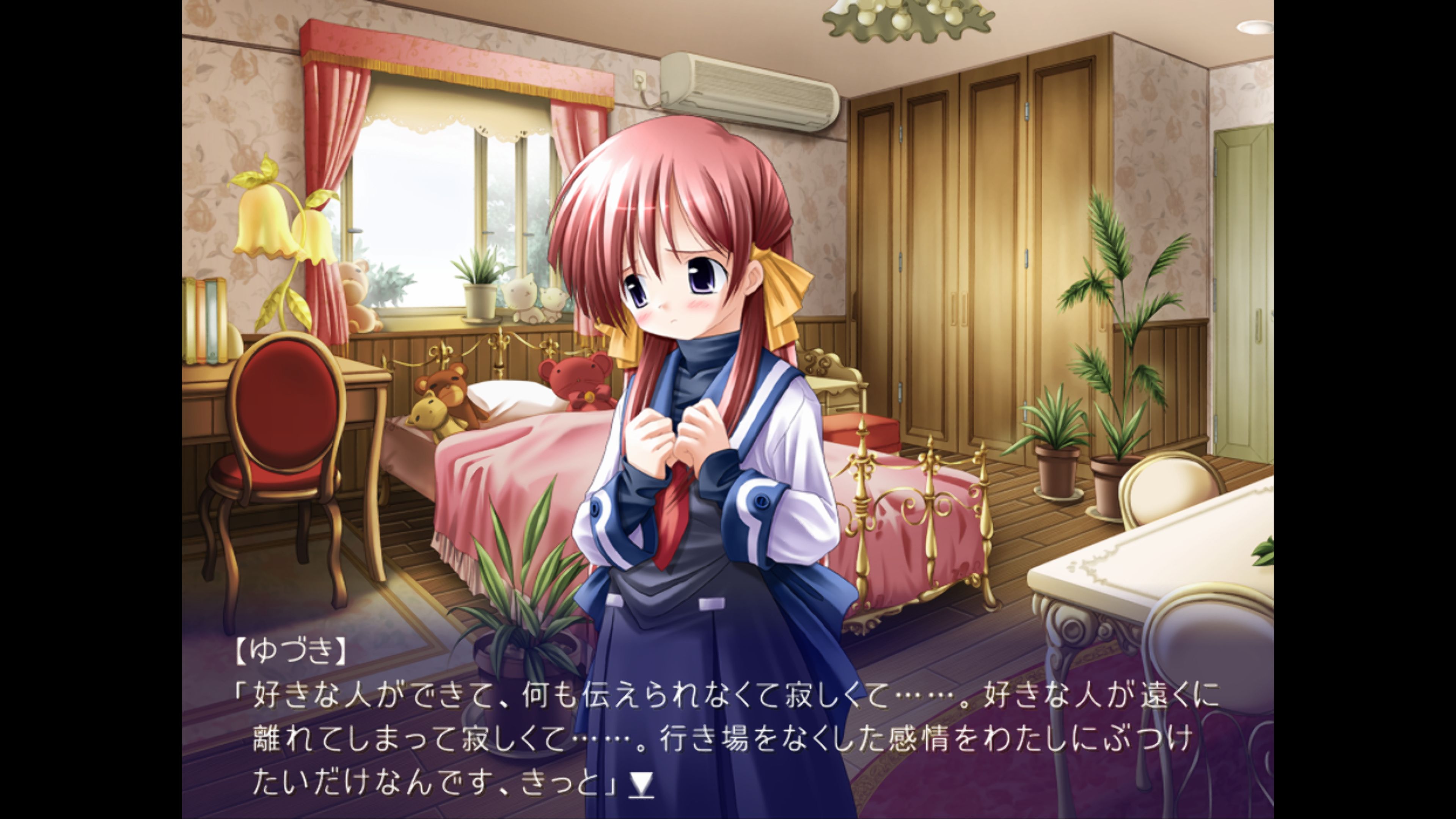 Story-wise, Yuu and Chika do seem like the most “main” routes. Chika’s route is even locked after the other three, but the reality is that actually they are the short routes that feel more like a prologue and epilogue. Yuu is the cousin annoying imouto type of character that I’ve never been a fan of, although I won’t deny she’s cute. Her route is the most forgettable, feeling more like an intro to the themes of the game. Chika is the turbo-cute osananajimi; her route is actually only one chapter long, so basically 1/3 the length of the others, and has zero drama. Somehow it is still pretty nice, since it nails the 優しさ of the game after all the shit that went down in the other three routes, and being short also helps with not getting boring. This route feels like the epilogue, since the protag seems like he has actually matured after everything seen in the other routes, and the fact that it is the only route where the good ending is him staying in the town instead of going back to Tokyo probably is a hint to that too.